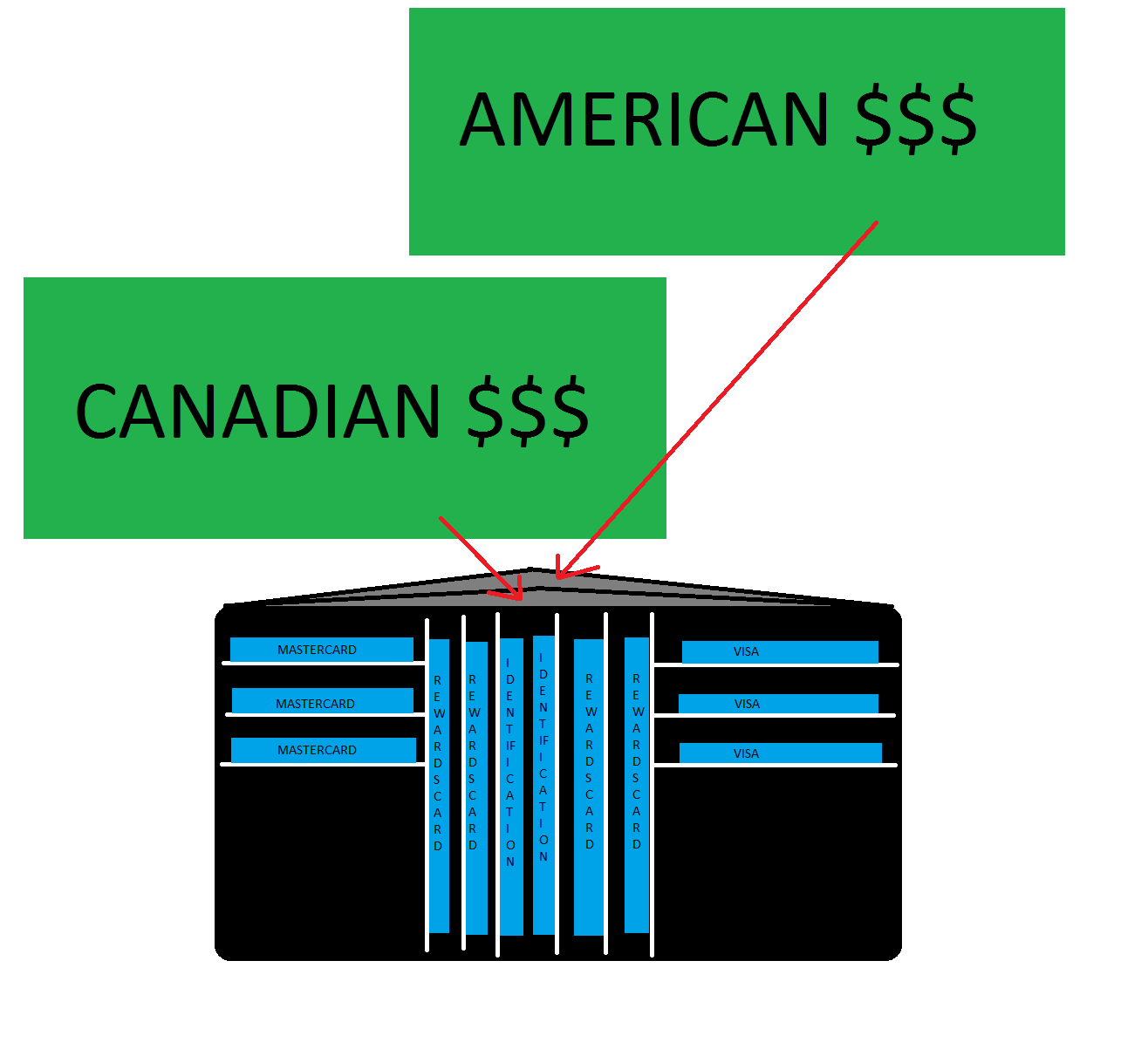 • Two cash compartments to fit Canadian & American Dollars